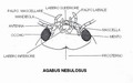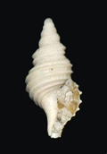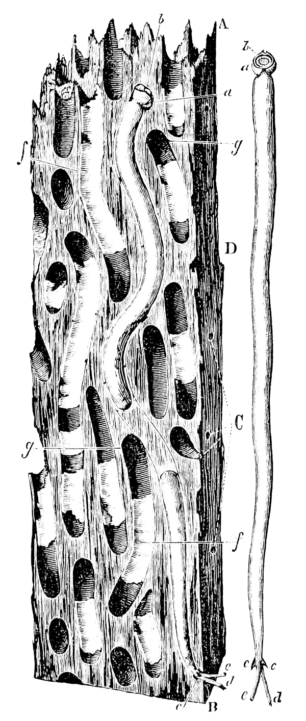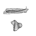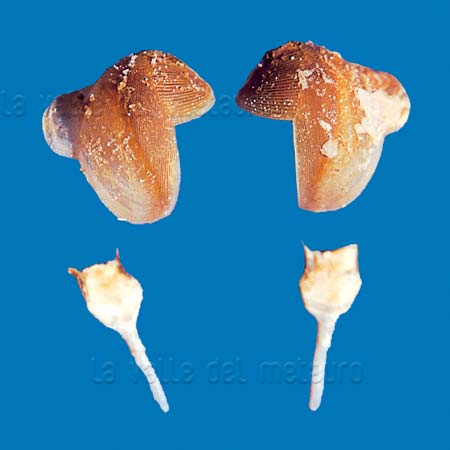 Teredo navalis: in alto l'intero animale con i due sifoni sporgenti dal legno entro cui vive e all'altra estremità la piccola conchiglia, in basso una valva della conchiglia