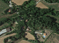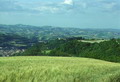 Terrazzi d'erosione in destra idrografica del F. Metauro a Fossombrone. In primo piano la zona di Carpineto col terrazzo del 1 ordine, di fronte il Colle dei Cappuccini (si vedono i cipressi del Convento) con terrazzi d'erosione; sullo sfondo le colline in sinistra idrografica