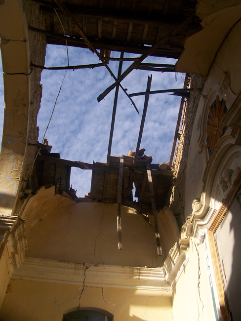 Tetto sfondato sopra l'altare, Chiesa dell'Amiana, Mombaroccio, ottobre 2008
