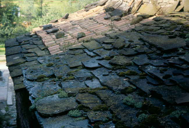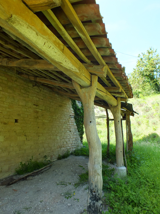 Tettoia di una casa lungo la strada che risale la valle del Fosso del Rio, ai piedi del M. Paganuccio (Monti del Furlo), maggio 2012