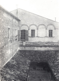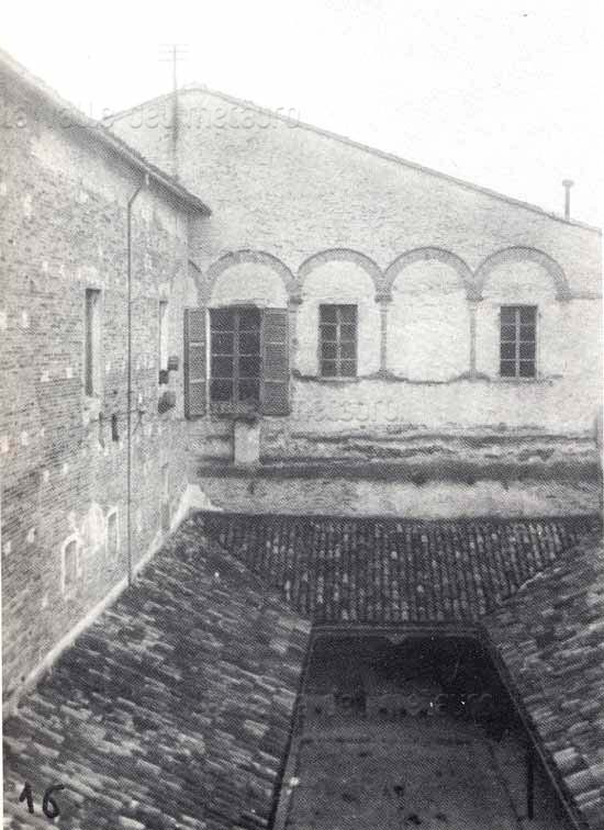 Tettoia della pescheria entro la Corte Malatestiana di Fano, prima del 1929 circa (da BATTISTELLI e DIOTALLEVI, 1982)