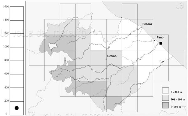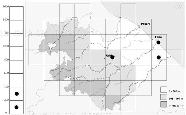 Testuggine palustre europea - Carta di distribuzione in Provincia di Pesaro e Urbino, 2002. Legenda: cerchio grande = 7 e più rilevazioni dal 1980; cerchio medio = 4-6 rilevazioni; cerchio piccolo = 1-3 rilevazioni; quadrato = dato anteriore al 1980; triangolo = dato fuori dei confini della Provincia. Nel grafico altitudinale: cerchio grande = 15 e più rilevazioni; cerchio medio = 5-14 rilevazioni; cerchio piccolo = 1-4 rilevazioni. Ulteriori notizie nella scheda: Come leggere le schede dei Rettili