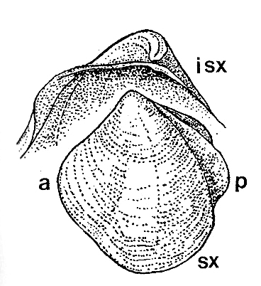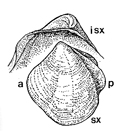 Thyasira biplicata. sx = valva sinistra, isx = interno valva sinistra, a = margina anteriore, p = margine posteriore