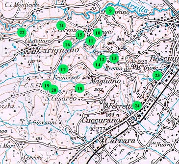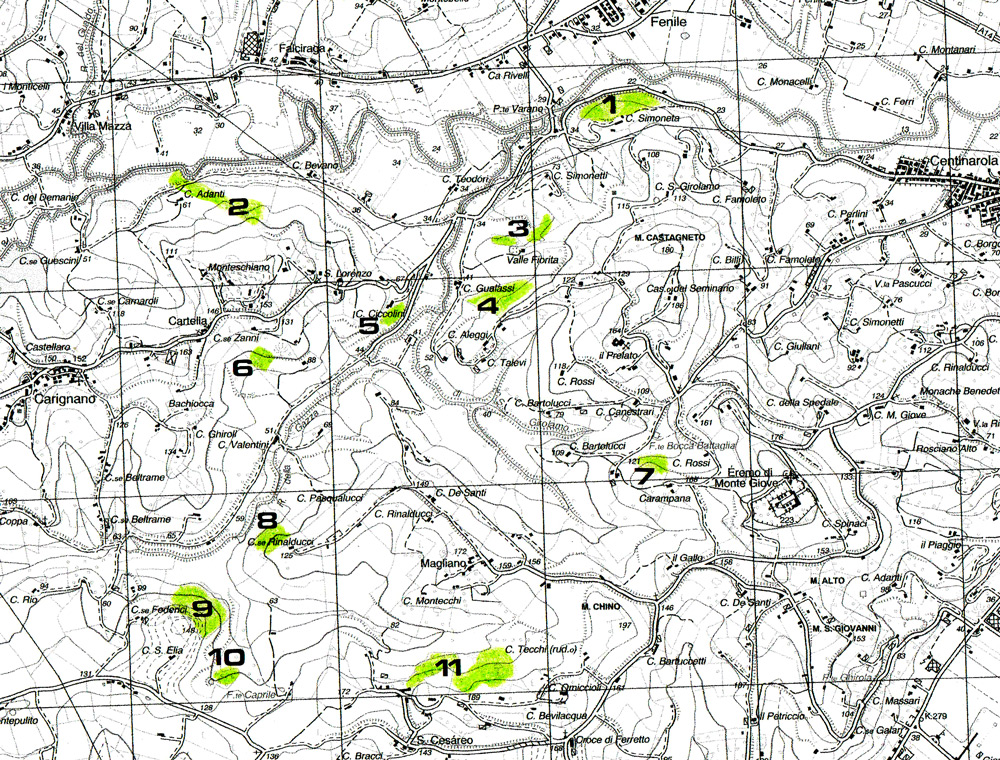 Legenda: 1 - Bosco di Severini, 2 - Bosco di Adanti, 3 - Boschetti (2) a Nord di Valle Fiorita, 4 - Cespuglieto e boscaglia di Valle Fiorita, 5 - Boschetto del Rio della Gazza, 6 - Bosco di Pagnoni, 7 - Bosco di Casa Carampana, 8 - Bosco di Case Rinalducci, 9 - Bosco di S. Elia, 10 - Boschetto e cespuglieto di Fonte Caprile, 11 - Bosco, boscaglia e cespuglieto di S. Cesareo