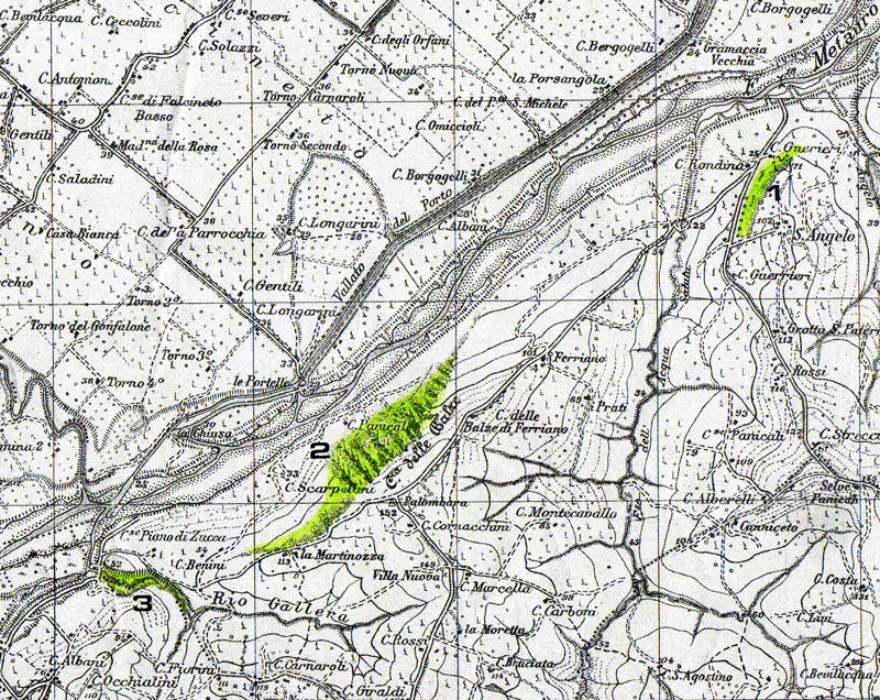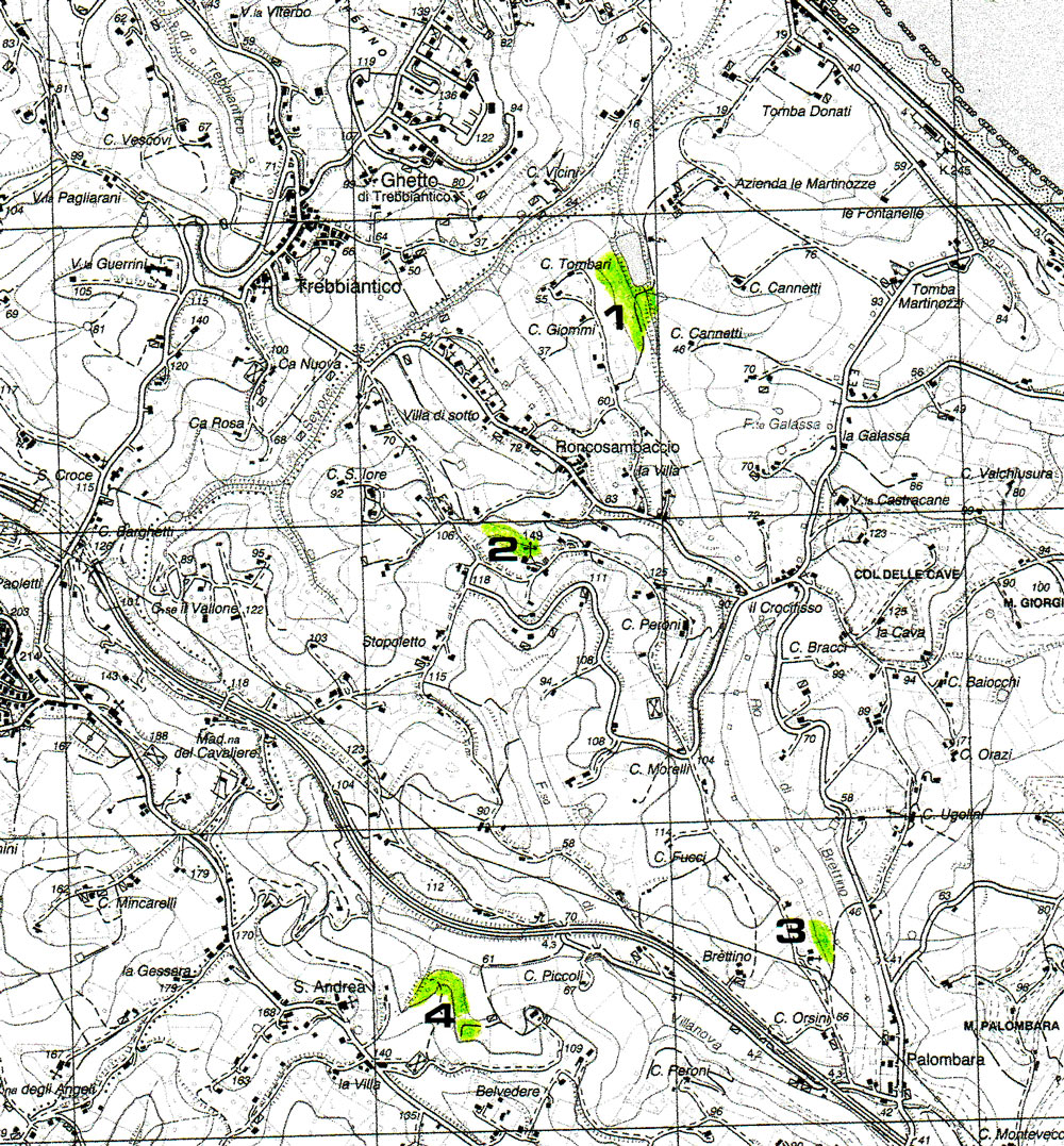 Legenda: 1 - Bosco di Montevecchio, 2 - Bosco di Roncosambaccio, 3 - Boschetto di Brettino, 4 - Boschetti (2) presso S. Andrea in Villis