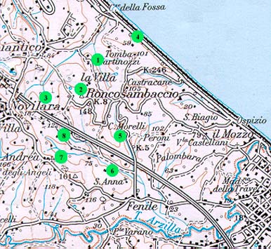 1 - Bosco di Montevecchio, 2 - Bosco di Roncosambaccio, 3 - Bosco e boscaglia presso Case Il Vallone, 4 - Boscaglia e cespuglieto sulla falesia a S.E. di Fosso Sejore, 5 - Boschetto di Brettino, 6 - Bosco, boscaglia e cespuglieto tra Casa Peroni e S. Anna, 7 - Boschetti (2) presso S. Andrea, 8 - Bosco, boscaglia e cespuglieto del Fosso di Villanova