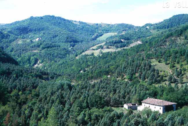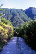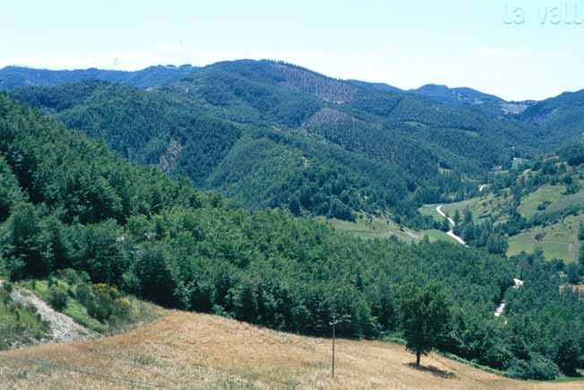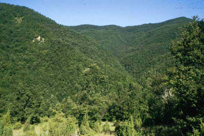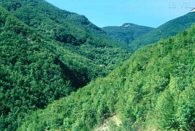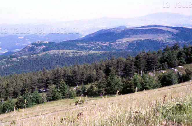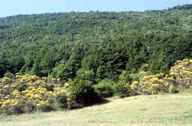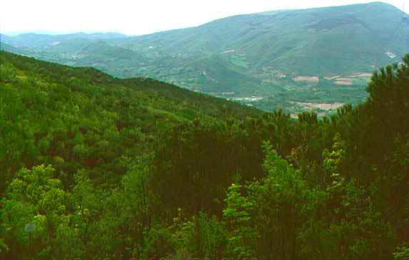 Boschi di caducifoglie e di conifere sulle Cesane, 1998; sullo sfondo il M. Paganuccio