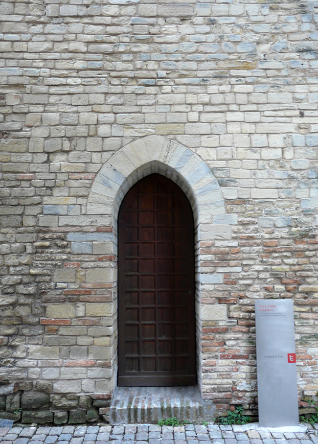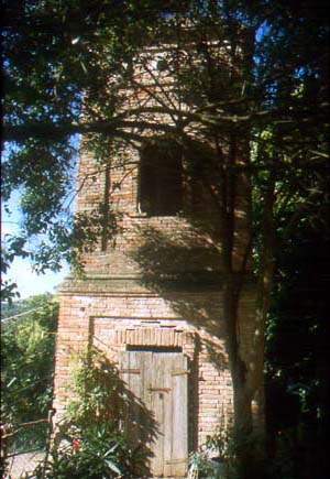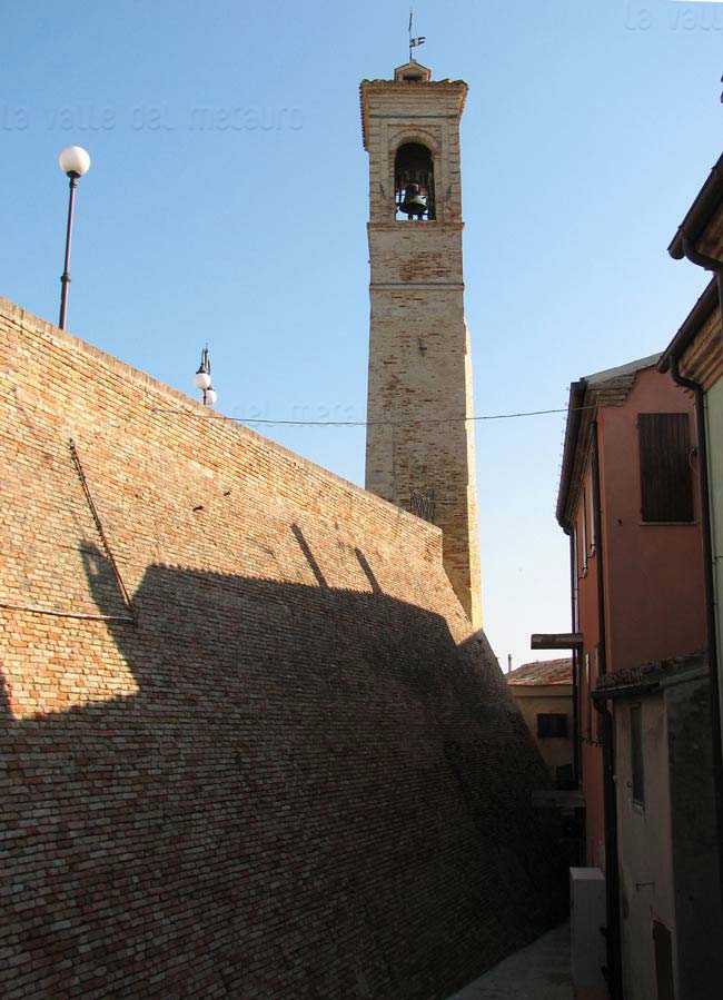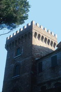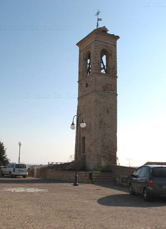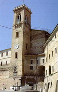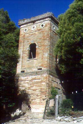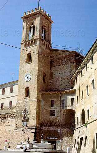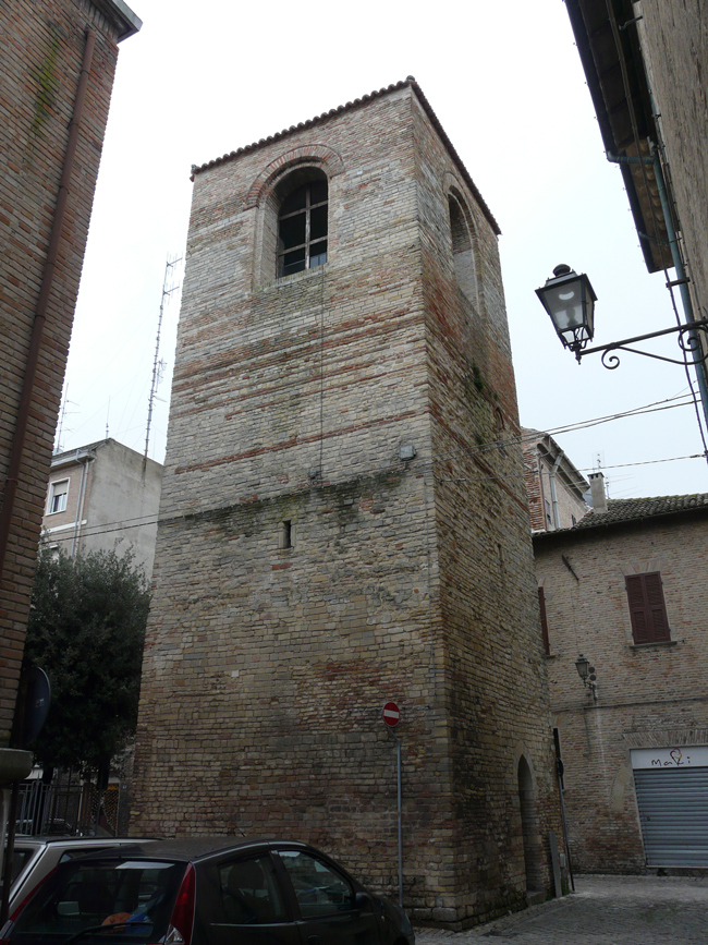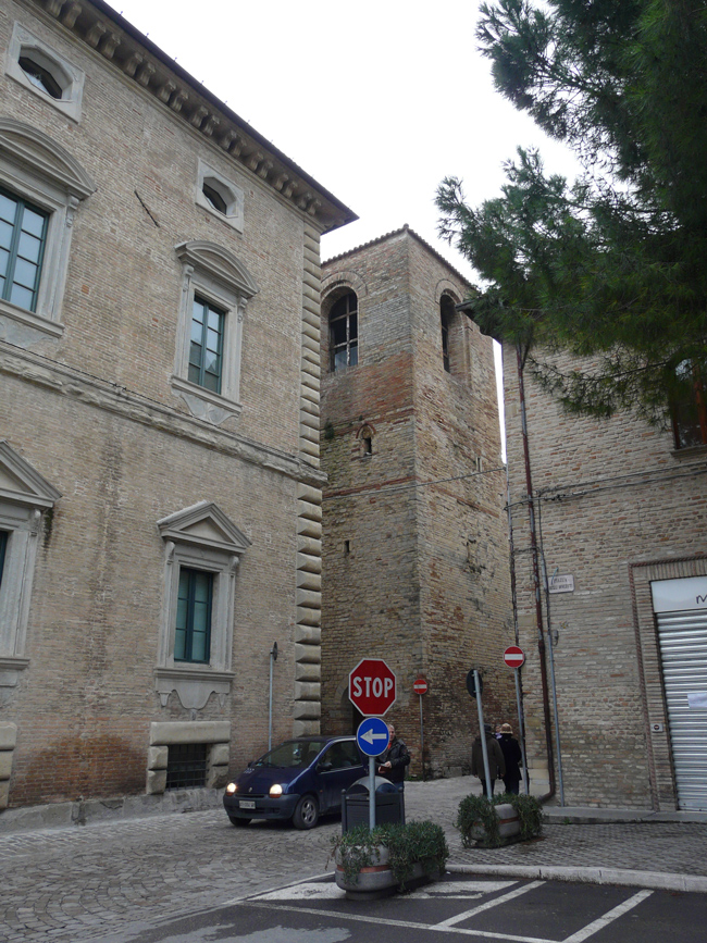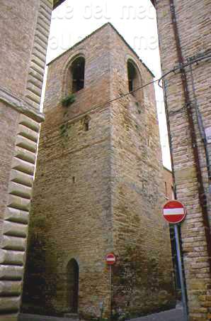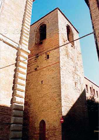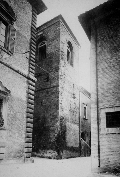 Torre di S. Elena, con sulla destra il loggiato della Chiesa e Ospedale di S. Croce, prima del 1944 (da AMADUZZI e LAMEDICA 1984)