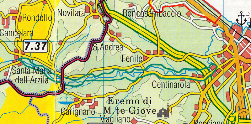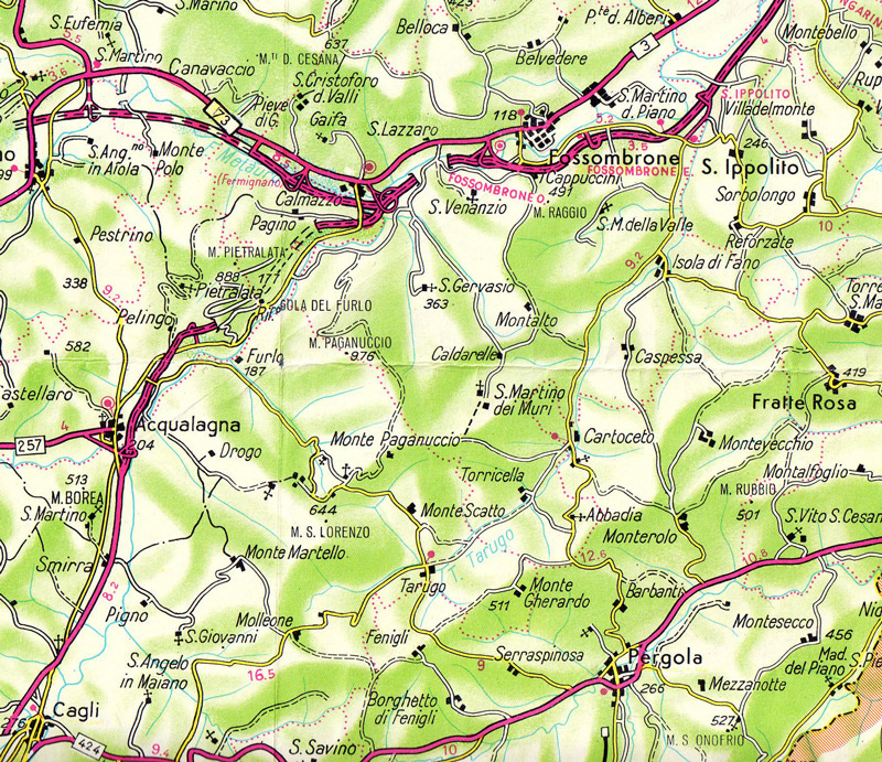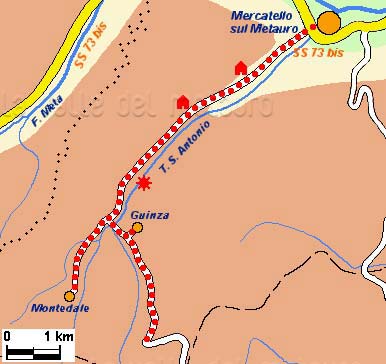 Torrente Arzilla da Centinarola di Fano a S. Maria dell’Arzilla, con il SIC “Corso dell’Arzilla” perimetrato in verde. Carta faunistico venatoria della Provincia di Pesaro e Urbino, scala 1:100.000