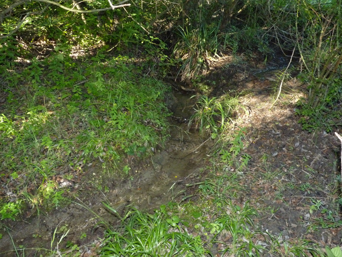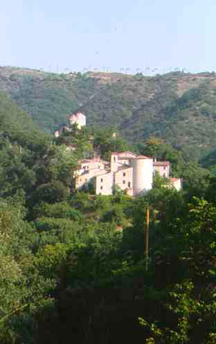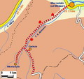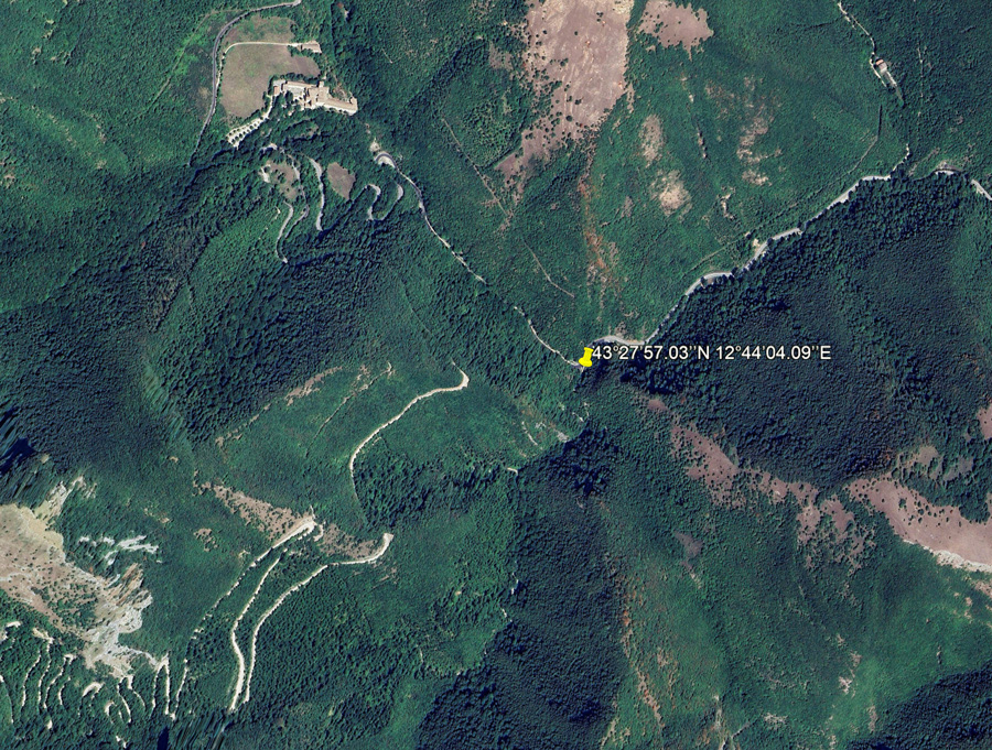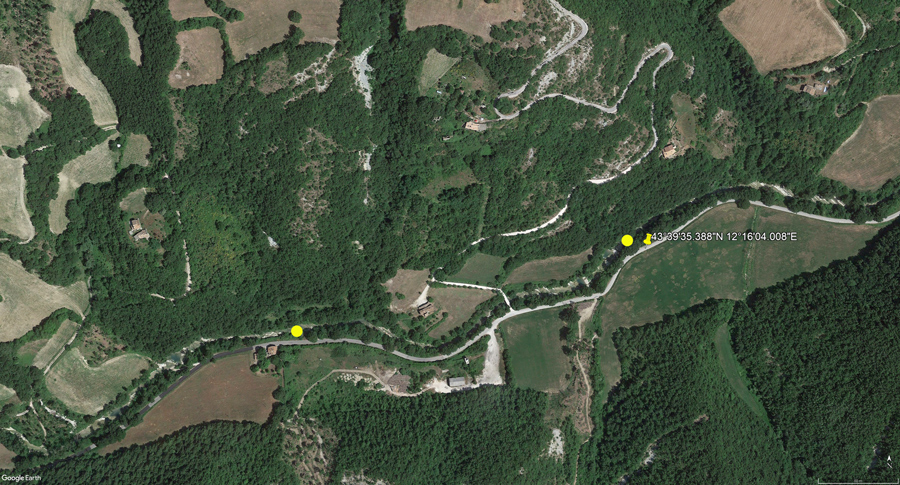 Torrente Auro a monte di Borgo Pace, con indicati da pallino giallo l'accesso 0,5 km a monte di Case S. Andrea (con segnate le coordinate) e l'accesso presso Casa Poderina (da: Google Earth, ripresa del 7 luglio 2021)
