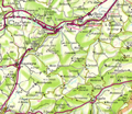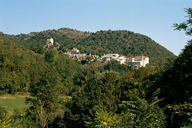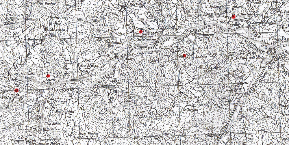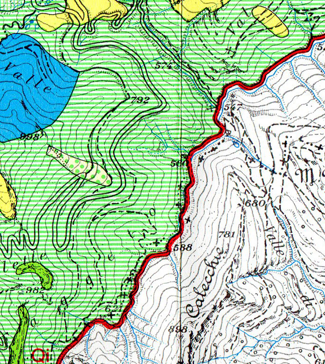 Torrente Calecchio, M. Catria (il versante destro della sua valle appartiene all'Umbria). In verde barrato formazioni con prevalenza di Carpino nero e Orniello, cedui. Carta forestale 1:25.000 Az. Spec. Consorz. Catria, Ed. S.E.C.L.A., 1987