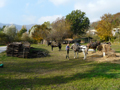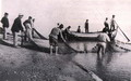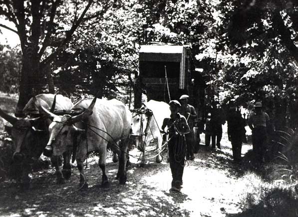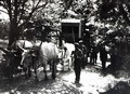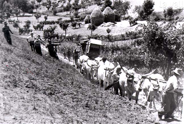 Trasferimento di una trebbiatrice, dintorni di Fano, 1940-49 circa (Archivio E. Pierucci). Vengono usati per il trasporto due paia di buoi