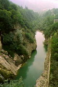 Tratto del Candigliano subito a valle della Diga del Furlo, incassato tra pareti rocciose, luglio 1989