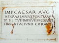 Trascrizione dell'iscrizione che ricorda l'apertura della galleria del Furlo voluta da Vespasiano: L'imperatore Cesare Augusto Vespasiano, pontefice massimo, nell'anno della sua settima potestŕ tribunizia, acclamato imperatore per la diciassettesima volta, padre della patria, console per l'ottava volta, censore, provvide che venisse costruito