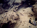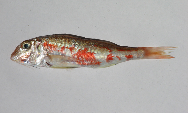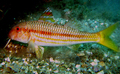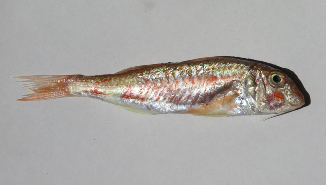 Triglia di scoglio in abito giovanile, 5,5 cm; i barbigli sono nascosti sotto il mento. Mare di Fano presso riva, giugno 2007