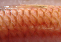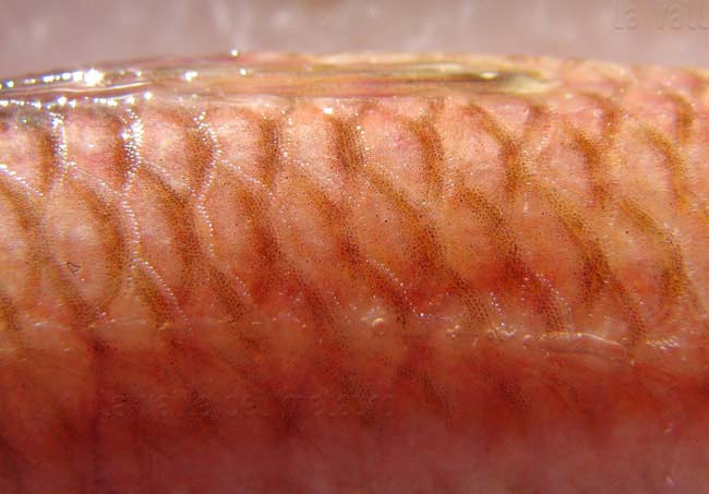 Triglia di scoglio di 9 cm, particolare delle squame del dorso a bordo posteriore pigmentato. Mare di Fano presso riva, luglio 2007