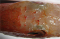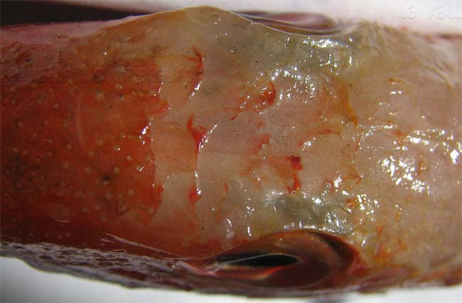 Triglia di fango di 18 cm, particolare della bocca. Pescherie di Fano, giugno 2006