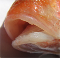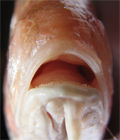 Triglia di scoglio di 21 cm, particolare della bocca. Pescherie di Fano, giugno 2006