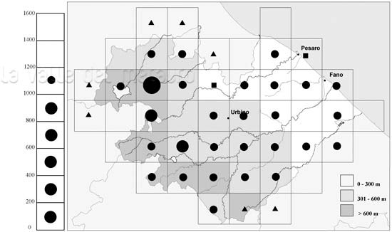 Tritone punteggiato - Carta di distribuzione in Provincia di Pesaro e Urbino, 2002. Legenda: cerchio grande = 7 e più rilevazioni dal 1980; cerchio medio = 4-6 rilevazioni; cerchio piccolo = 1-3 rilevazioni; quadrato = dato anteriore al 1980; triangolo = dato fuori dei confini della Provincia. Nel grafico altitudinale: cerchio grande = 15 e più rilevazioni; cerchio medio = 5-14 rilevazioni; cerchio piccolo = 1-4 rilevazioni. Ulteriori notizie nella scheda: Come leggere le schede degli Anfibi