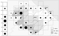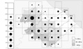 Tritone crestato italiano - Carta di distribuzione in Provincia di Pesaro e Urbino, 2002. Legenda: cerchio grande = 7 e più rilevazioni dal 1980; cerchio medio = 4-6 rilevazioni; cerchio piccolo = 1-3 rilevazioni; quadrato = dato anteriore al 1980; triangolo = dato fuori dei confini della Provincia. Nel grafico altitudinale: cerchio grande = 15 e più rilevazioni; cerchio medio = 5-14 rilevazioni; cerchio piccolo = 1-4 rilevazioni. Ulteriori notizie nella scheda: Come leggere le schede degli Anfibi