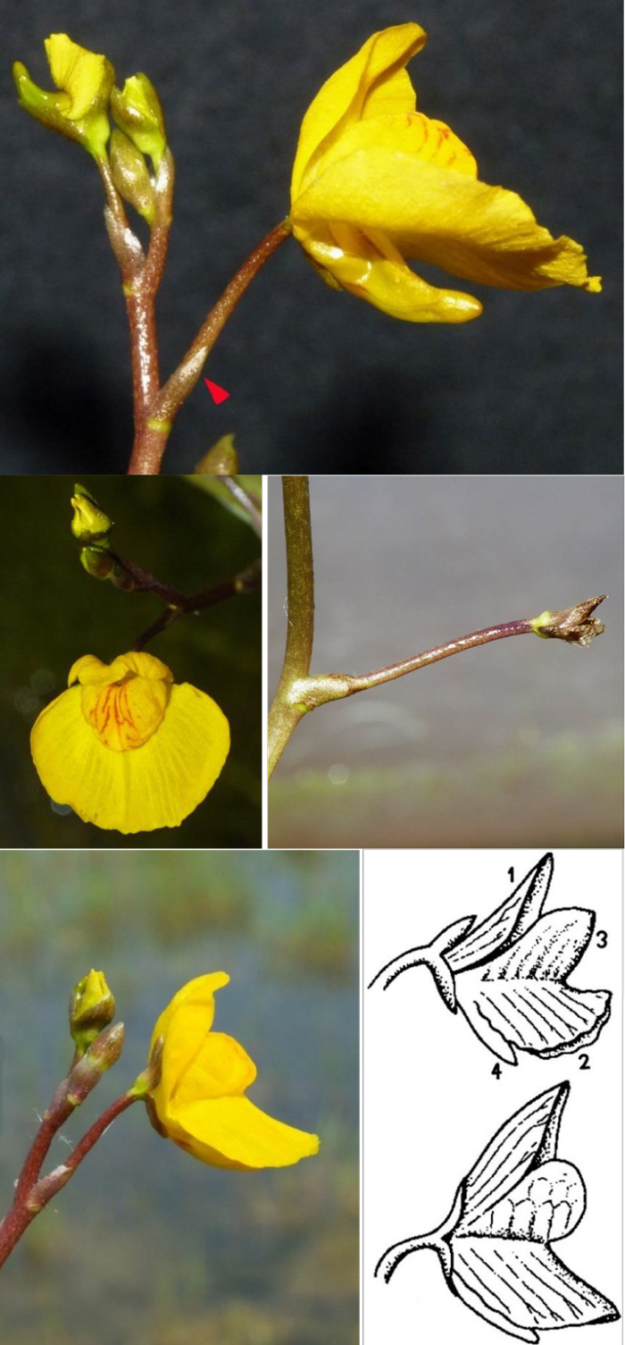 Utricularia australis, Lago Vicini lungo il Metauro a 1 km dalla foce, 13 giugno 2021: in alto: indicata in rosso la guaina del pedicello all’inserzione sulla rachide, con ben visibile lo sperone del fiore e pedicello lungo 2,7 volte la guaina; in mezzo a dx: pedicello diritto e rivolto verso l’alto dopo la fioritura, lungo 4,3 volte la guaina, 26 giugno 2021 (foto L. Poggiani); in basso a dx: Utricularia australis 1 - labbro sup., 2 - labbro inf., 3 - palato, 4 - sperone (da: TISON & DE FOUCAULT, 2014)