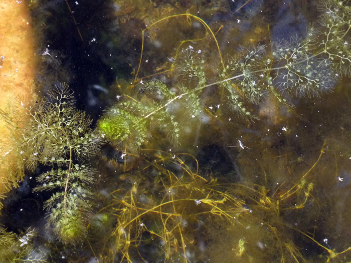 Utricularia australis, Lago Vicini lungo il Metauro a 1 km dalla foce, giugno 2018; a dx: otricelli di circa 2 mm, coi quali cattura piccoli organismi acquatici (pianta carnivora), ottobre 2020