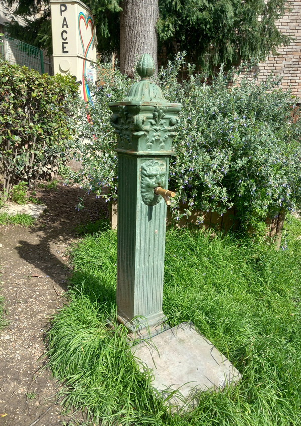 Vecchia fontanella recuperata nel centro storico di Fano e sistemata nel giardinetto all'angolo tra Via Alessandrini e Via San Paterniano, marzo 2025