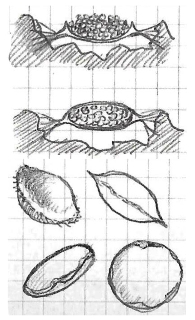 Varie fasi della costruzione della capsula ovigera del Ragno lupo in terrario (disegno di Luciano Poggiani, 1958)