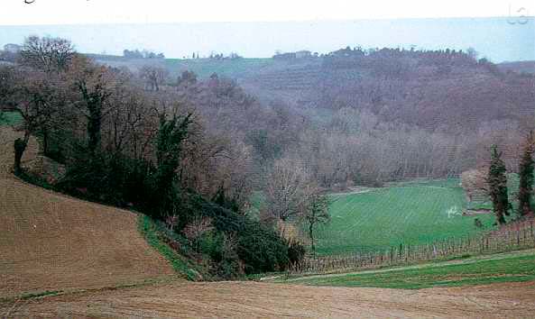 Bosco e cespuglieto di S. Cesareo (Fano), con il nucleo abitato omonimo sulla cresta, febbraio 2007