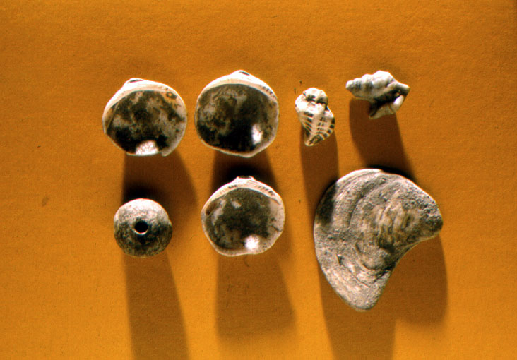 Villaggio della tarda Età del Bronzo a Chiaruccia di Fano, dicembre 1980. A partire da in alto a sinistra: due valve di Glycymeris insubrica, Ocenebra erinaceus, Aporrhais pespelecani, fusarola in terracotta, valva di Glycymeris insubrica, valva di Ostrea edulis