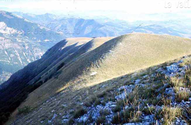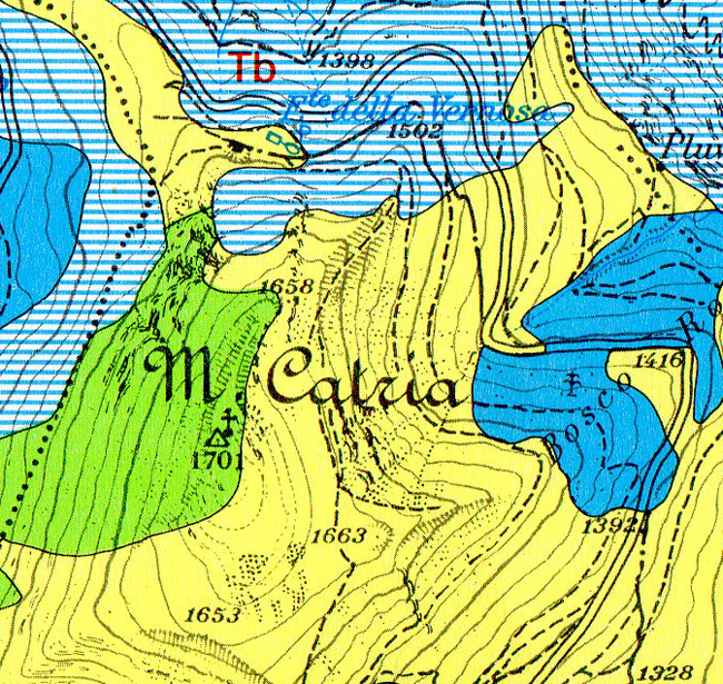 Zona sommitale del M. Catria. In giallo pascoli; in verde formazioni erbacee rupestri; in blu faggete. Carta forestale 1:25.000 Az. Spec. Consorz. Catria, Ed. S.E.C.L.A., 1987