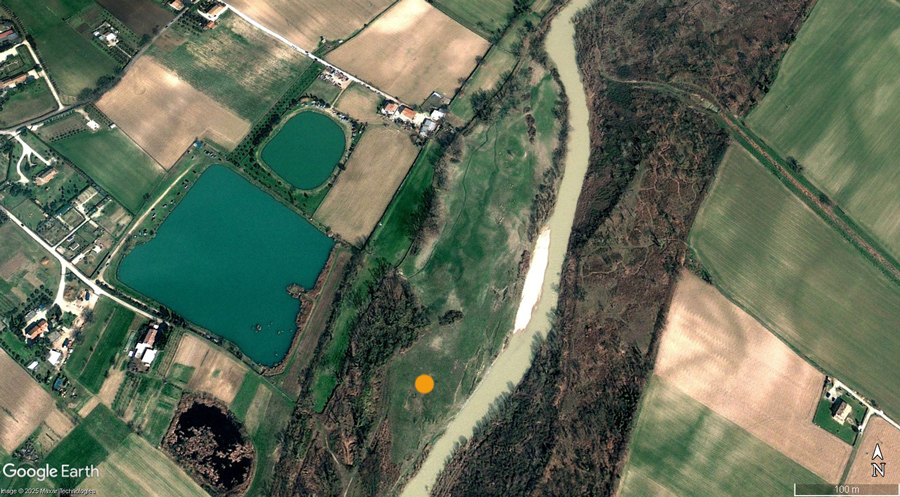 Zona erbosa in riva sinistra del Metauro a 4 km dalla foce, segnata con un punto arancio (da: Google Earth, ripresa del 22 dicembre 2024)