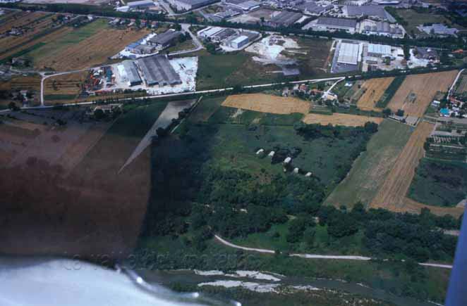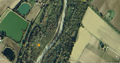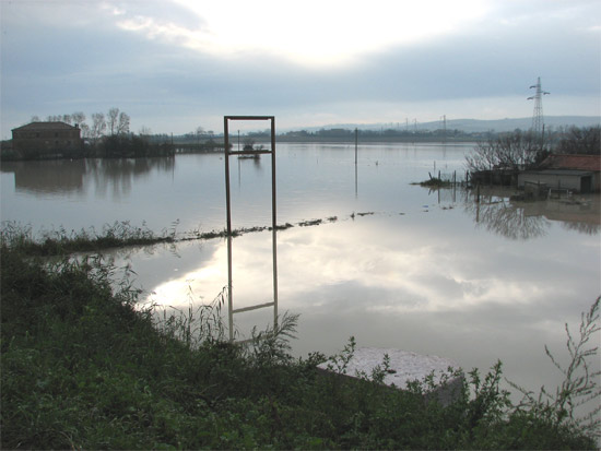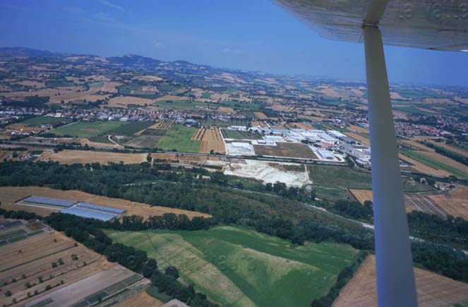 Zona erbosa in riva sinistra del Metauro a 4 km dalla foce, segnata con un punto arancio (da: Google Earth, ripresa del 14 marzo 2010)