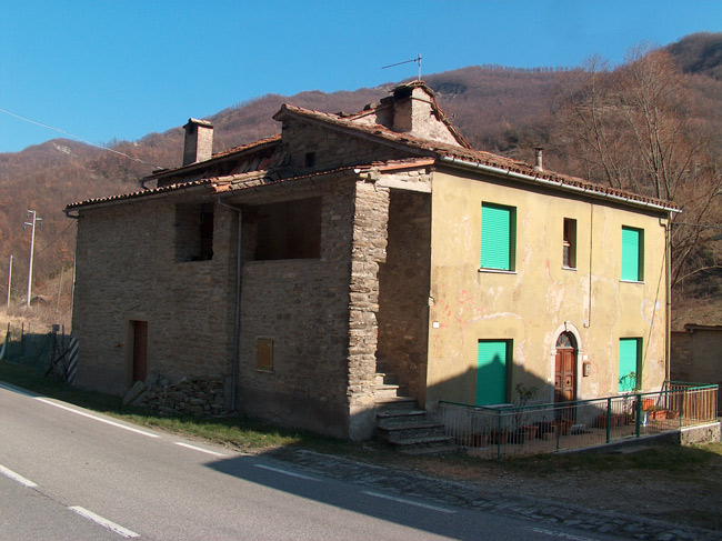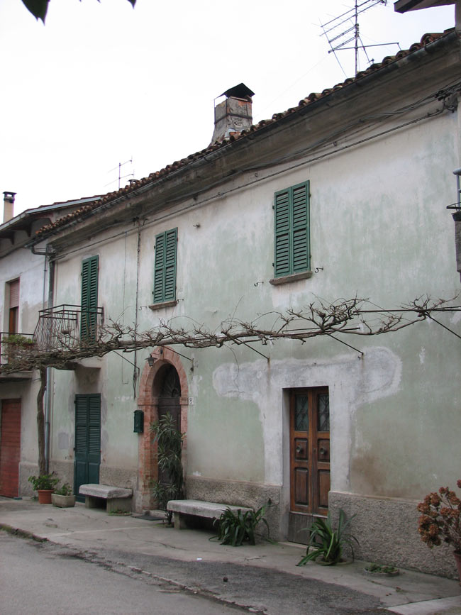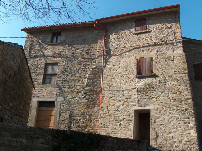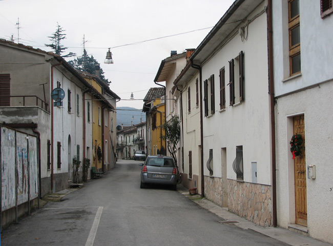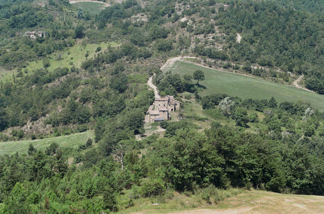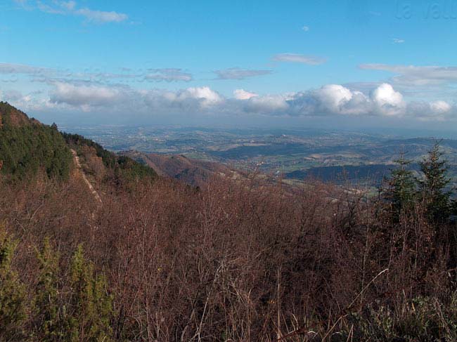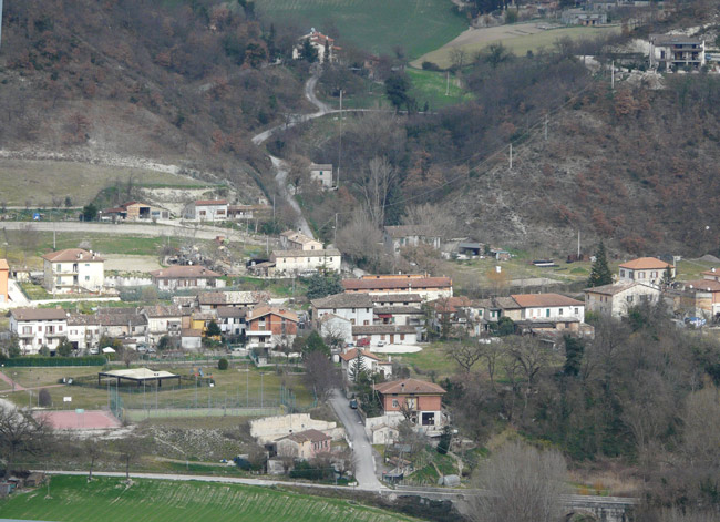 Calmazzo (Fossombrone) visto dal M. Pietralata (Monti del Furlo), febbraio 2008. Nel piano sulla sinistra è visibile il Recinto sepolcrale di epoca romana, protetto da una tettoia