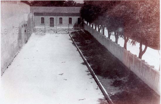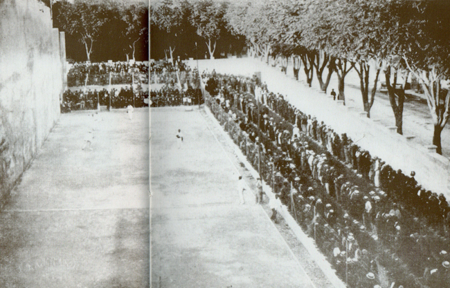 Campo di gioco del pallone al bracciale o Gioc del palòn in Viale XII Settembre a Fano (foto d'epoca). In fondo la Palestra Venturini